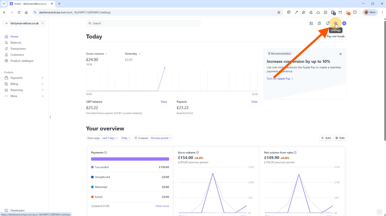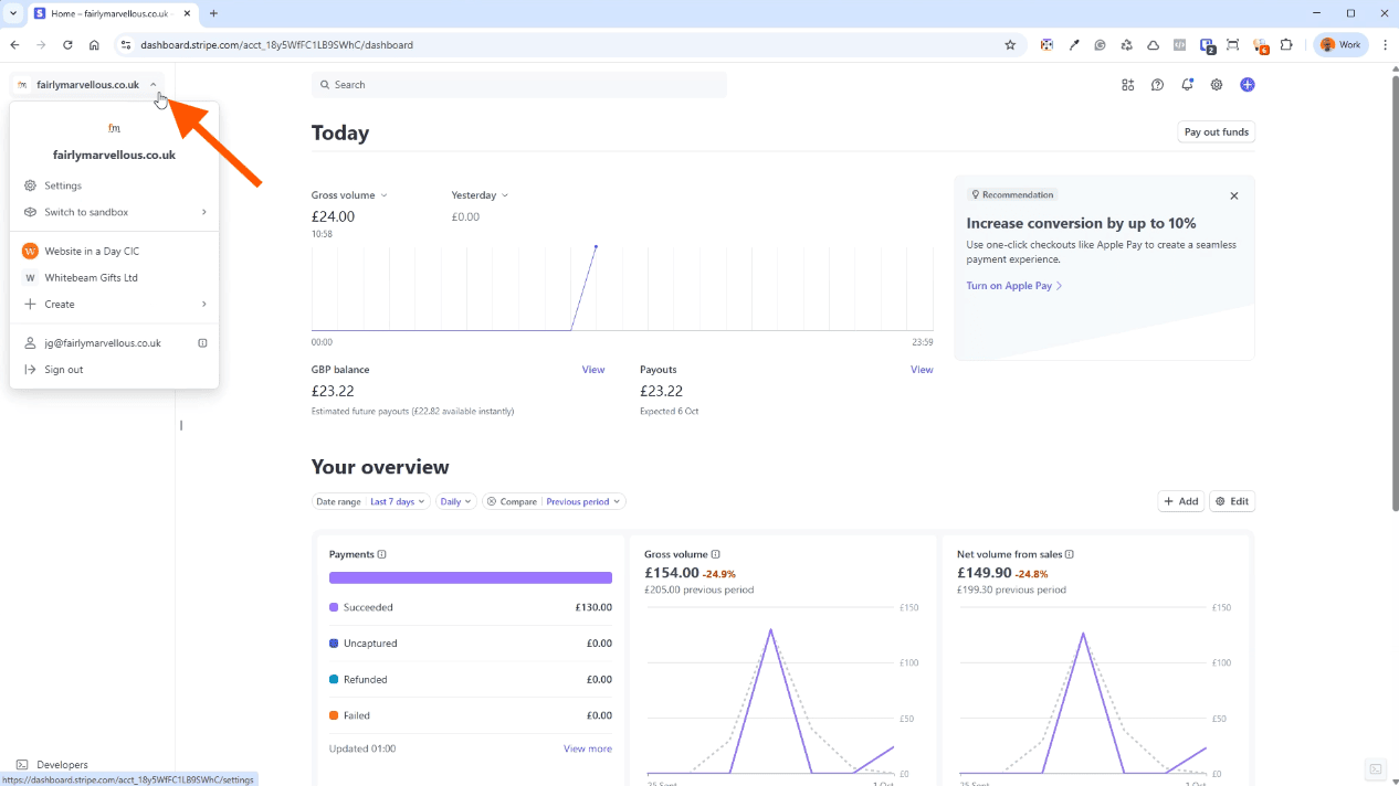 Once you have logged into your Stripe account, you will be taken to this dashboard. If you have more than one business connected to Stripe, use the dropdown on the left to make sure you have the correct one selected.