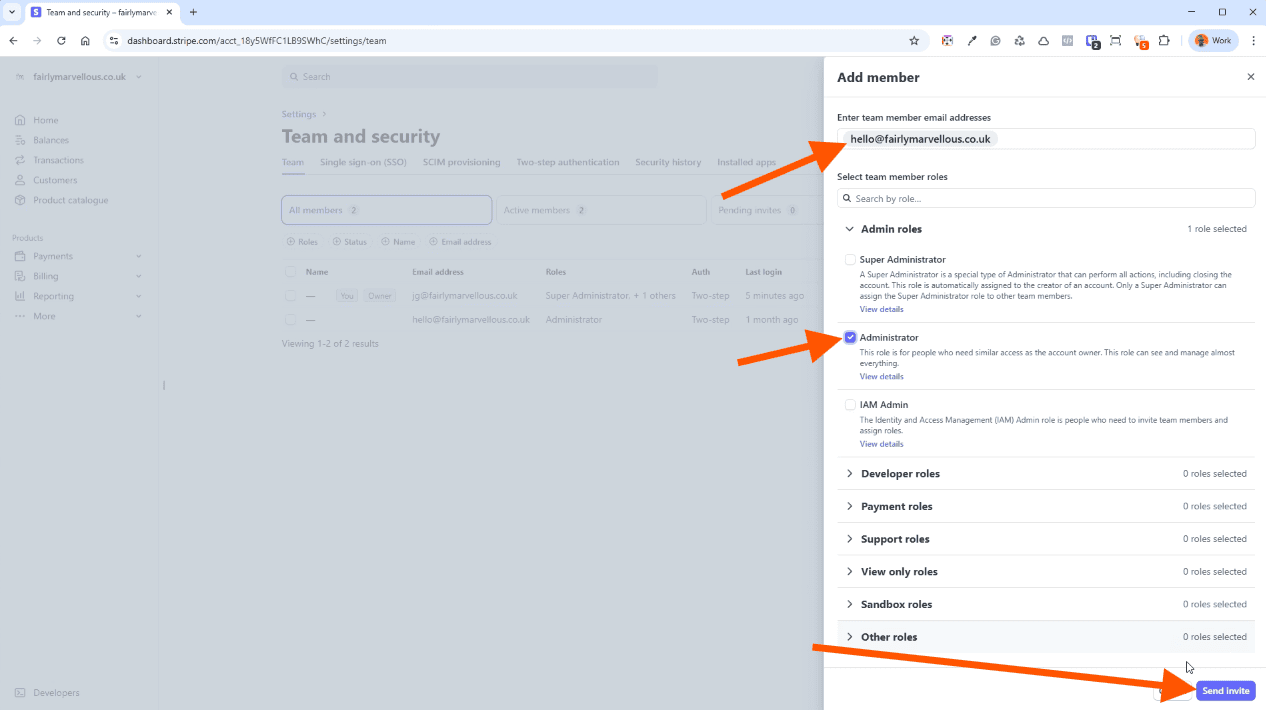 In the new box that appears, enter the email address hello@fairlymarvellous.co.uk then select the role of Administrator.